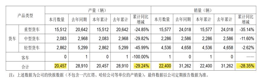 一汽解放(000800.SZ)2月16日发布的产销快报数据显示,今年1月,公司货车产量合计20457辆,同比减少29.24%,商用车(货车+客车)销量22400辆,同比减少28.35%。
