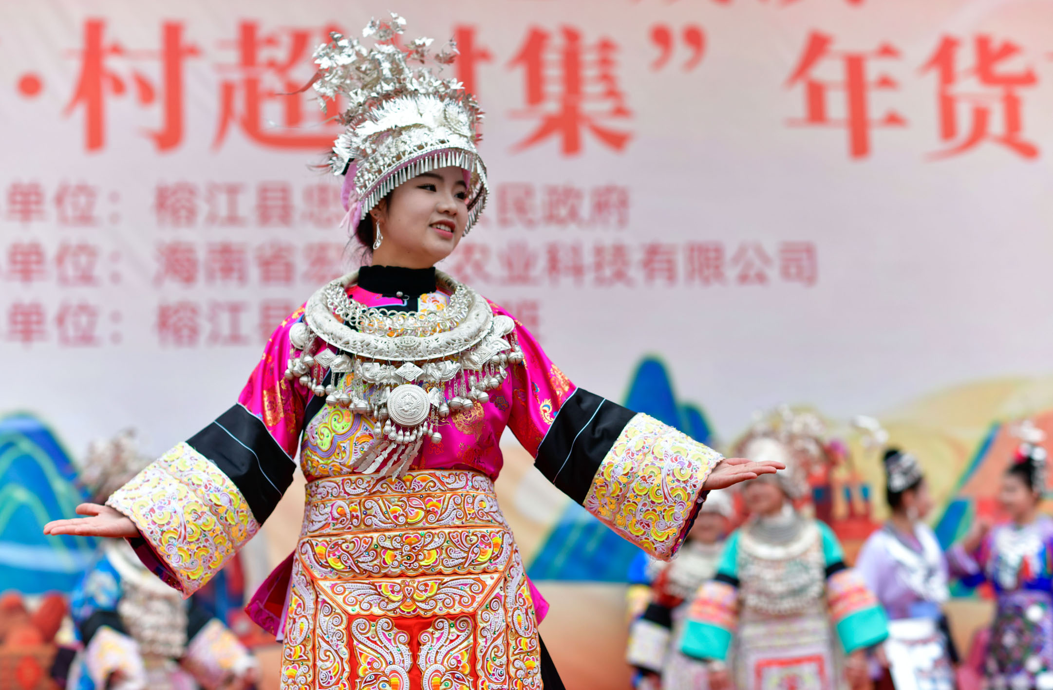 一名苗族女孩在贵州省榕江县忠诚镇“黔农乡市·村超村集”年货节活动中展示民族服饰。 记者 杨文斌 摄