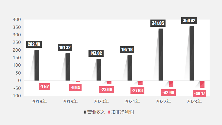 同花顺iFinD数据显示,2018年至2023年,赛力斯营业收入分别为202.40亿元、181.32亿元、143.02亿元、167.18亿元、341.05亿元、358.42亿元,尽管2021年至2023年营收实现了连续增长,但赛力斯近年扣非净利润却处于持续亏损状态,其中2018年至2023年扣非净利润依次为-1.52亿元、-8.84亿元、-23.08亿元、-27.93亿元、-42.96亿元、-48.17亿元,累计亏损金额超150亿元。
