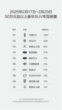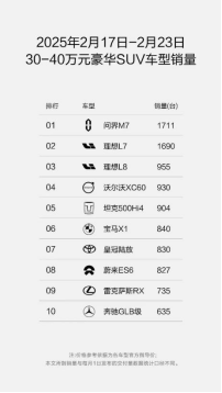 近日出炉的汽车周量榜显示,2025年2月17日—2月23日,问界M9蝉联50万元级以上豪华SUV车型销量冠军,问界M7稳居30万—40万元豪华SUV车型销量榜首位,延续2024年新势力销冠的势头。