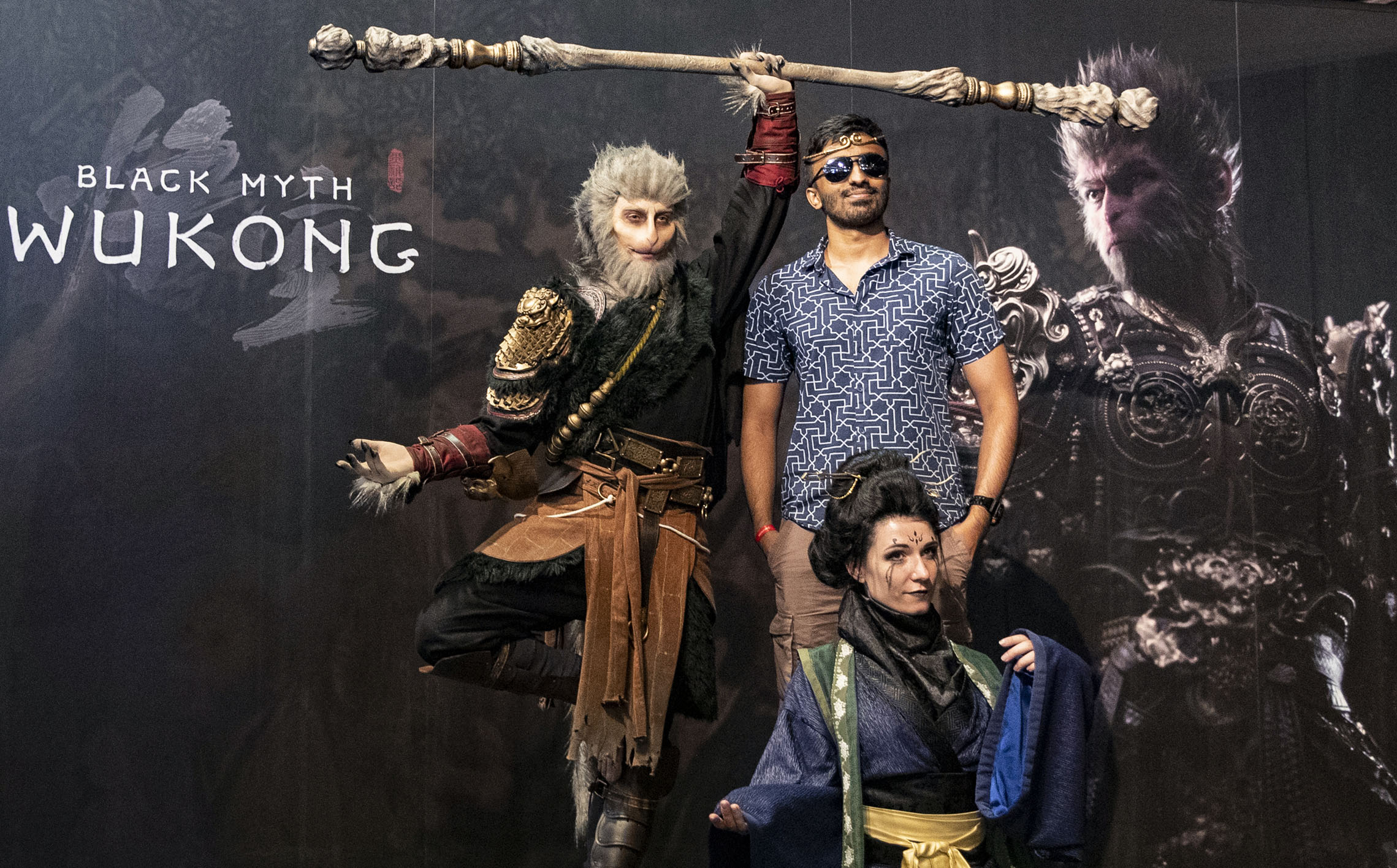 人们在2024年科隆国际游戏展《黑神话:悟空》拍照区拍照。 记者 张帆 摄