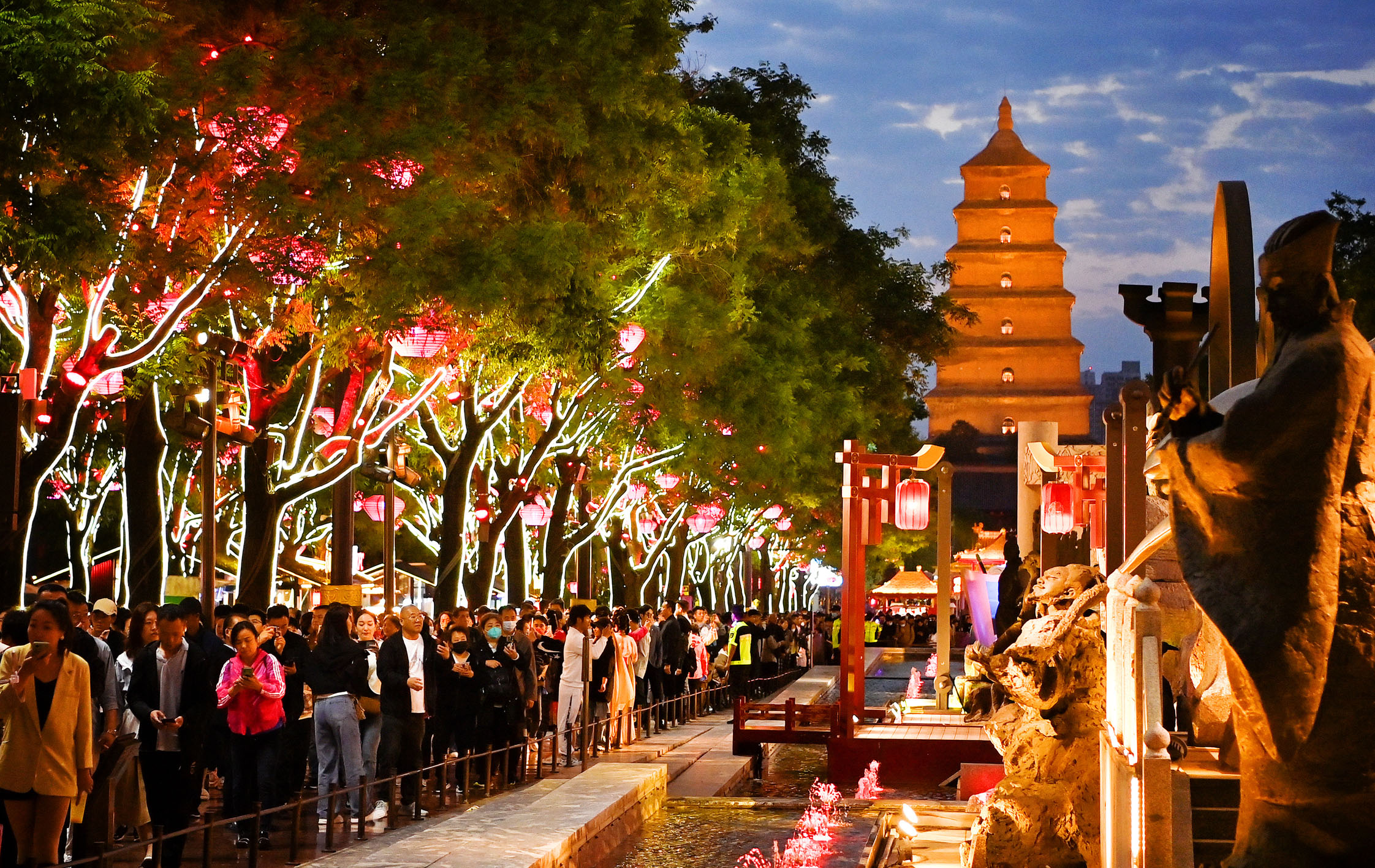 游客在西安大唐不夜城游览。 新华社发(邹竞一 摄)
