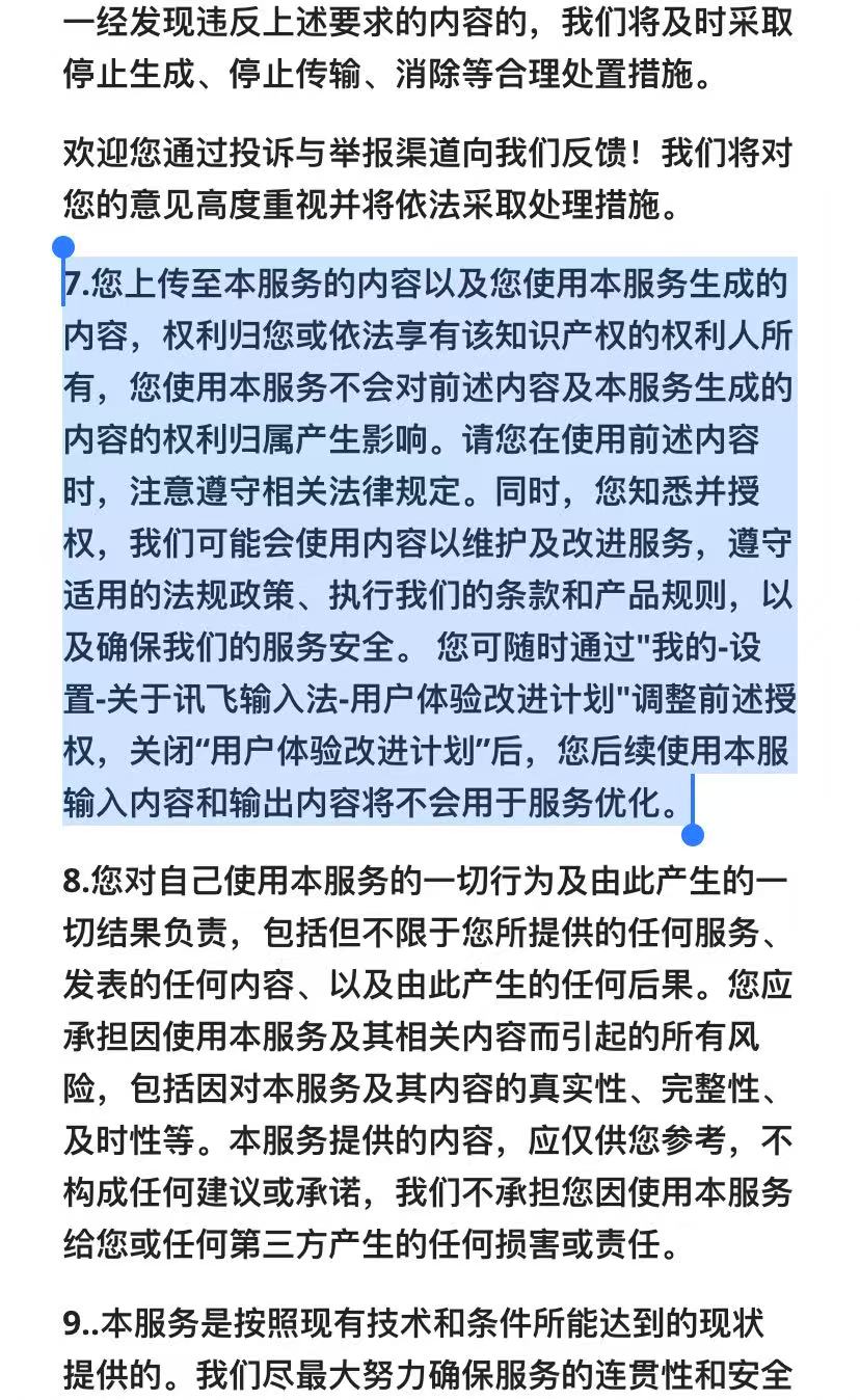 对此,3月12日晚,讯飞输入法方面对《经济参考报》记者表示,感谢大家对他们的关注和监督,他们高度重视反馈的问题。在前期他们已经关注到该问题,并对《使用规则》等文本进行了系统排查,并定位到《使用规则》中第七条的原表述容易造成知识产权归属的争议。他们随即开展调整修订工作,现已完成《使用规则》的更新。