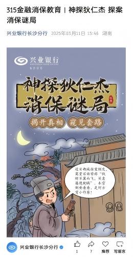同时,分行制作了以金融消费者权益保护为主题的探案漫画,内容涵盖防诈骗、个人信息保护、理性投资等金融知识。此外,还原创“以案说险”“兴消保兴课程”教育长图,通过微信公众号等媒体平台发布,让更多人在线上也能学习到实用的金融知识。