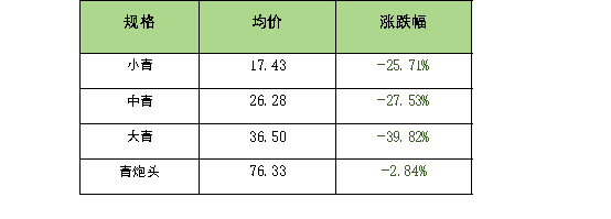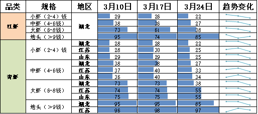 截至3月24日,青虾均价报39.14元/斤,环比下跌26.57%,整体价格也呈现回落态势。从细分规格来看,小青均价报17.43元/斤,环比下跌25.71%;中青均价报26.28 元/斤,环比下跌27.53%;大青均价报36.50元/斤,环比下跌39.82%;青炮头均价报76.33元/斤,环比下跌2.84%。本期各规格青虾价格均出现不同程度下跌,其中大青虾跌幅较显著。