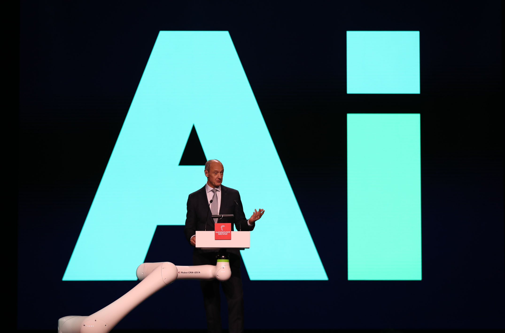 2025年德国汉诺威工业博览会日前举行开幕式。今年展会主题是“赋能工业可持续发展”,将聚焦人工智能、能源转型等议题。图为西门子股份公司董事会主席博乐仁在德国汉诺威工业博览会开幕式上致辞。