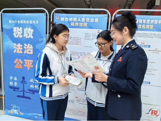 税务干部向中学生讲解第34个全国税收宣传月主题活动现场