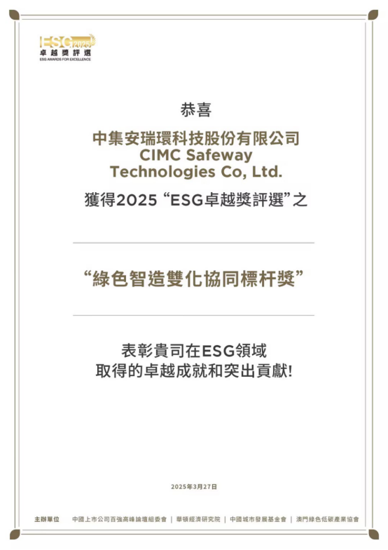近日,2025“ESG卓越奖评选”颁奖典礼在澳门举行。ESG卓越奖项聚焦于未来产业、绿色能源、社会责任与关爱、生命与健康、净零碳经济等关键领域,重点关注企业的绿色技术创新、低碳转型成效及治理透明度等维度,评选旨在表彰环境、社会和公司治理三个领域表现卓越并具有先锋引导作用的上市公司及优质企业。奖项由中国上市公司百强高峰论坛组委会、华顿经济研究院、中国城市发展基金会、澳门绿色低碳产业协会等机构主办。中集环科获得本届ESG卓越奖评选之“绿色智造双化协同标杆奖”。