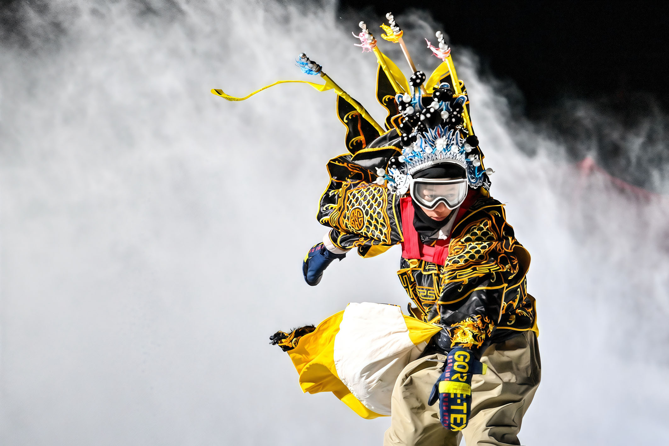 身穿京剧服饰的滑雪爱好者在雪道上滑行。新华社记者 张楠 摄