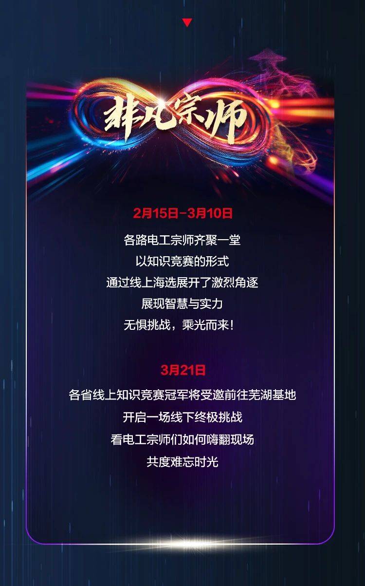 3月21日,各省线上知识竞赛冠军将受邀前往芜湖基地开启一场线下终极挑战,看电工宗师们如何嗨翻现场,共度难忘时光。