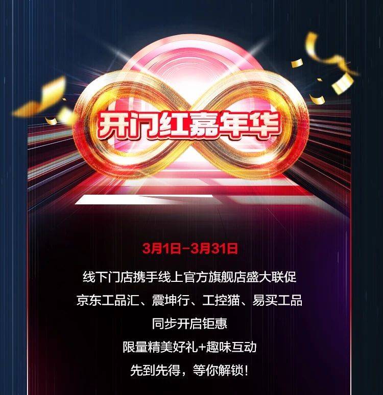 3月1日-3月31日,线下门店携手线上官方旗舰店盛大联促京东工品汇、震坤行、工控猫、易买工品同步开启钜惠,限量精美好礼+趣味互动,先到先得,等你解锁!