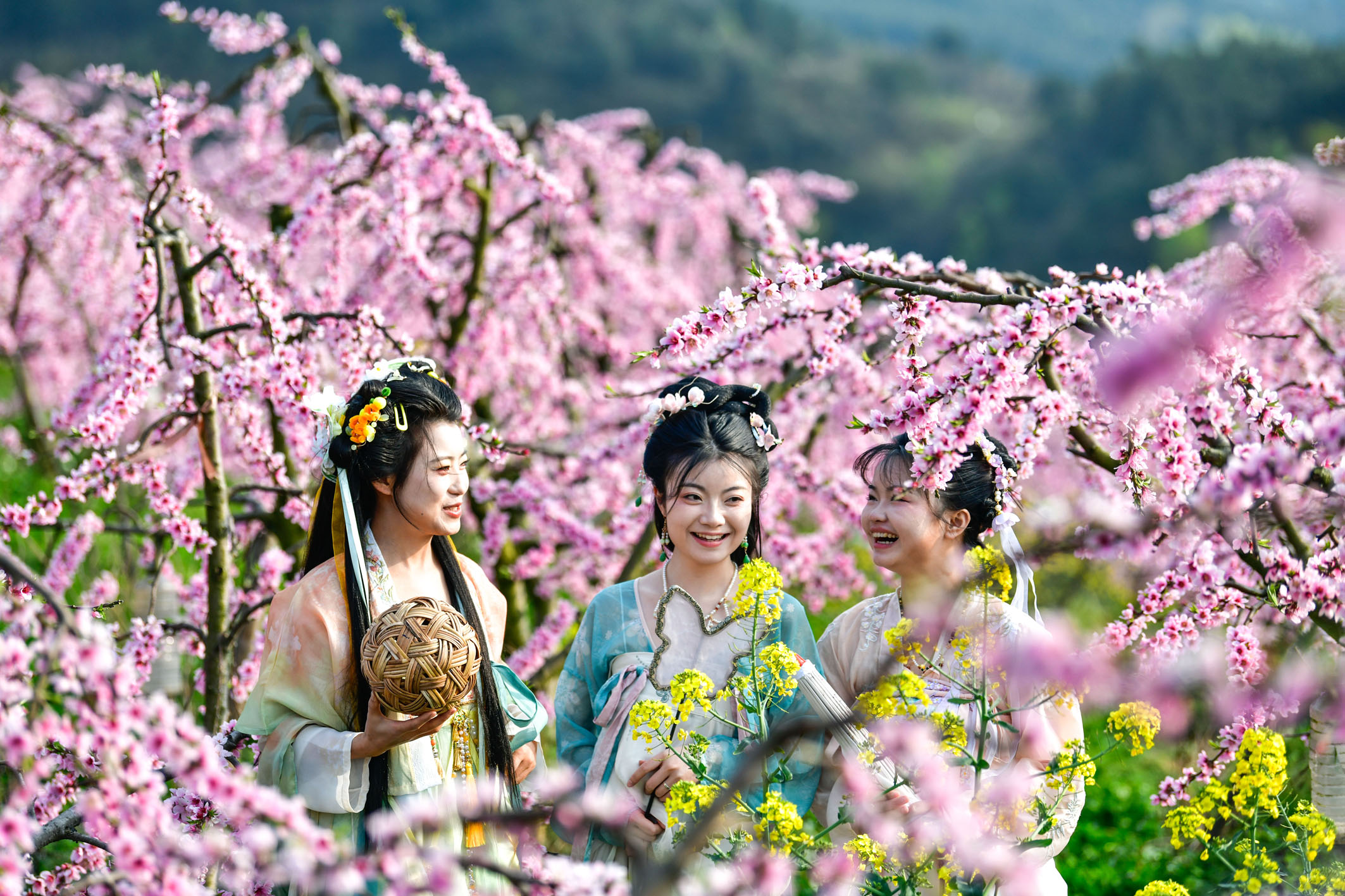 近年来,贵州省贵定县大力发展油菜、黄桃、刺梨等特色产业,形成“农业+旅游”发展模式,赏花踏青成为“春日经济”发展新动能。图为汉服爱好者在贵州省贵定县德新镇新铺村黄桃种植基地游玩。 新华社记者 杨文斌 摄
