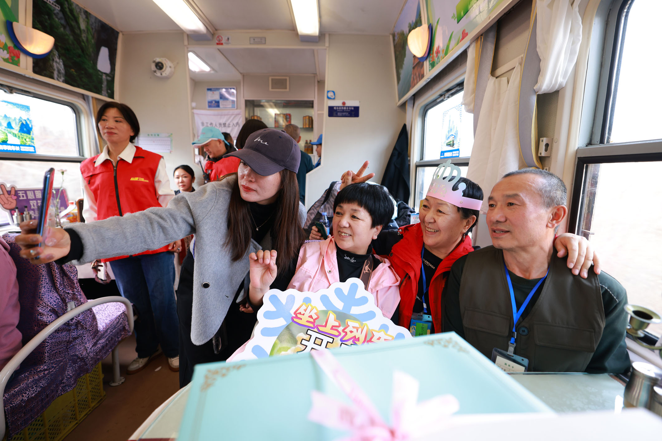 近日,在黑龙江省哈尔滨东站,546名银发旅客踏上Y64次旅游专列,开启为期14天的旅程,这是中国铁路哈尔滨局集团有限公司今年开行的首趟“银发旅游专列”。图为旅客在Y64次旅游专列的餐车庆祝生日。 新华社发(徐率 摄)