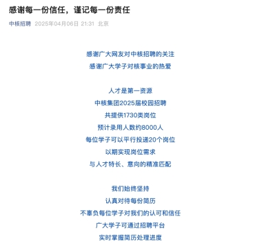 4月6日,中核招聘微信公众号发文回应,中核集团2025届校园招聘共提供1730类岗位,预计录用人数约8000人,每位学子可以平行投递20个岗位。