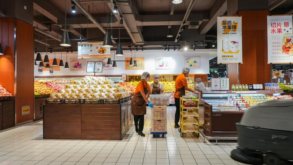 在河南许昌的胖东来生活广场店内,店员正在做当天开业前的准备工作。新华社记者 刘振坤 摄