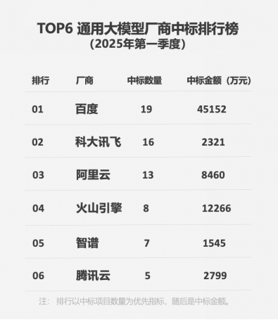 最新招投标市场数据显示,2025年第一季度,我国大模型相关项目招投标规模就呈现爆发式增长:中标项目总数达505个,项目总金额突破24亿元大关,达到24.67亿元,中标项目数量和金额同比2024年同期均实现近9倍增长,值得注意的是,仅2025年Q1的中标总额(24.67亿元)就已超越2024年前三季度的累计金额(21.28亿元),展现出强劲的市场动能。百度智能云以19个中标项目、4.5亿元中标金额领跑行业,两项核心指标在通用大模型厂商中均位列第一,市场领先优势显著。