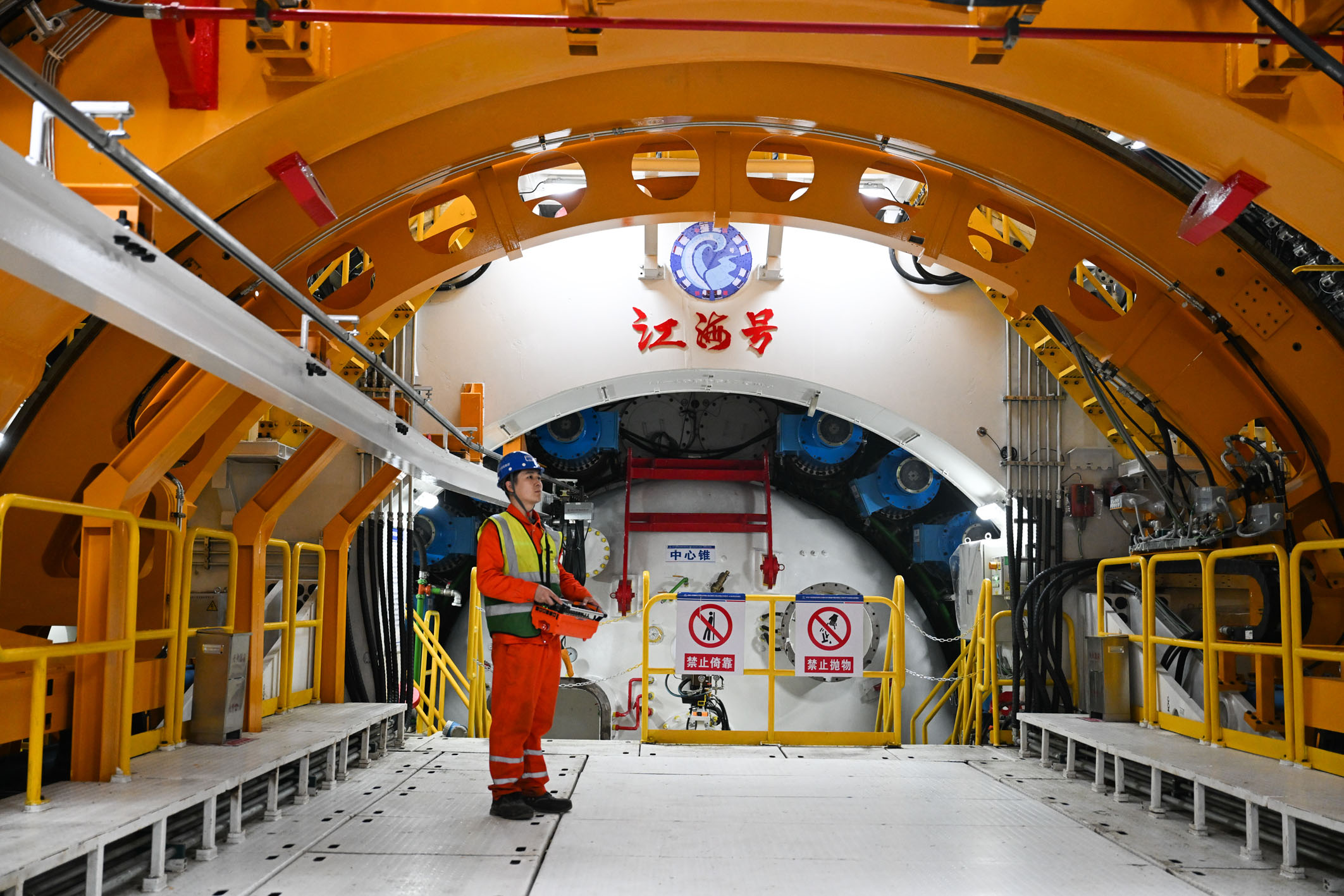 4月9日,中铁十四局工作人员在“江海号”盾构机内进行管片拼装作业。当日,在长江入海口的江苏南通海门,我国自主研制、最大开挖直径达16.64米的“江海号”盾构机缓缓启动,新“万里长江第一隧”、我国最长公路水下盾构隧道海太长江隧道正式开掘。
