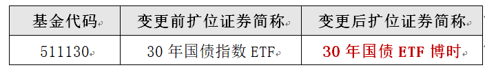 4月11日,博时基金发布《博时基金管理有限公司关于博时上证30年期国债交易型开放式指数证券投资基金变更场内扩位证券简称的公告》。博时上证30年期国债交易型开放式指数证券投资基金的场内扩位证券简称由“30年国债指数ETF”变更为“30年国债ETF博时”,新简称突出“博时基金”品牌标识,便于投资者快速识别与交易。