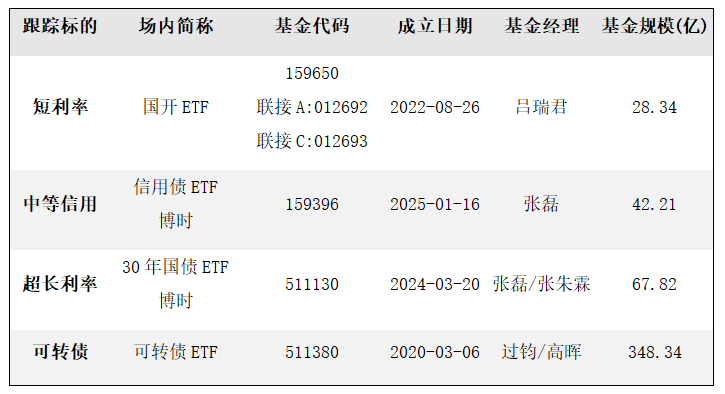 截至目前,博时基金布局了四只债券ETF——国开ETF、可转债ETF、30年国债ETF博时、信用债ETF博时,覆盖利率、信用、转债领域,四只产品同时兼具债券产品特征和场内ETF投资便利性。