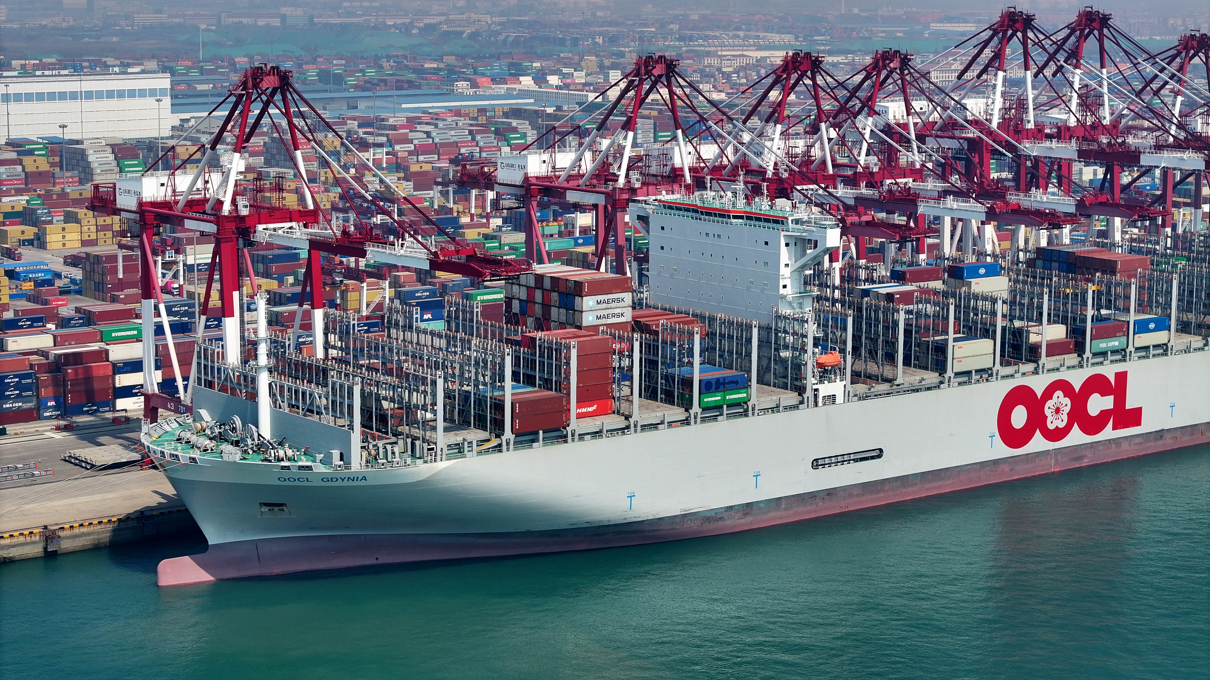 4月10日,一艘集装箱货轮在山东港口青岛港前湾集装箱码头进行装卸作业(无人机照片)。据山东省港口集团有限公司统计数据显示,2025年一季度,该集团的货物吞吐量、集装箱吞吐量同比增长分别超过4%、7%,展现出强劲的发展动能和韧性。