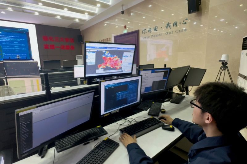 国网湖北电力公司员工关注雷电活动态势和影响范围,查看预警线路和设备情况。