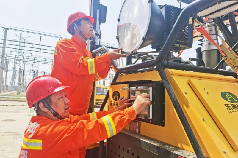 国网北京电力公司员工检查照明灯塔,准备随时应战大风天气。