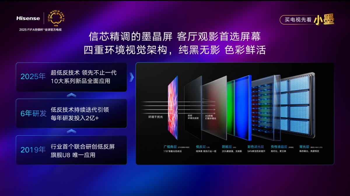 在屏幕创新上,海信小墨E5Q Pro墨晶屏解决了传统电视受环境光干扰的痛点。普通电视屏幕容易受眩光、倒影影响,雾面屏则存在透光率低、视角狭窄等缺陷。墨晶屏通过四重技术架构实现全新突破:低反层与防眩层组合将反射率压至2.6%,纯净黑度较行业均值提升100%;STW视角补偿层确保178°广视角下色彩一致性。负性液晶技术令透光率与响应速度同步提升,色彩表现增强54%。这一组合使电视在强光环境与多角度观看场景中均能呈现稳定画质。