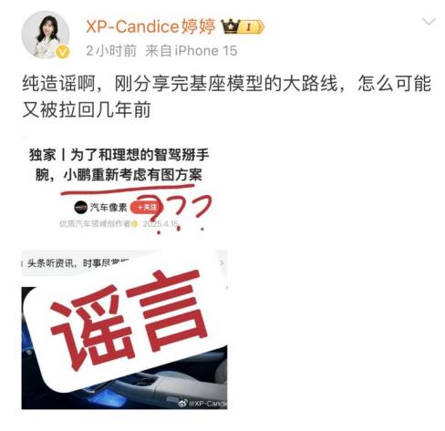 对此,小鹏汽车自动驾驶产品高级总监袁婷婷今日(4月15日)在微博平台上辟谣称,刚分享完基座模型的大路线,不可能被拉回到几年前。