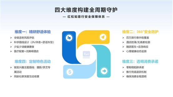 红松如意行打造的“全周期安全守护体系”,以适老化产品设计、立体安全保障、透明消费承诺、个性化体验定制四大核心模块,系统性破解老年旅行痛点。