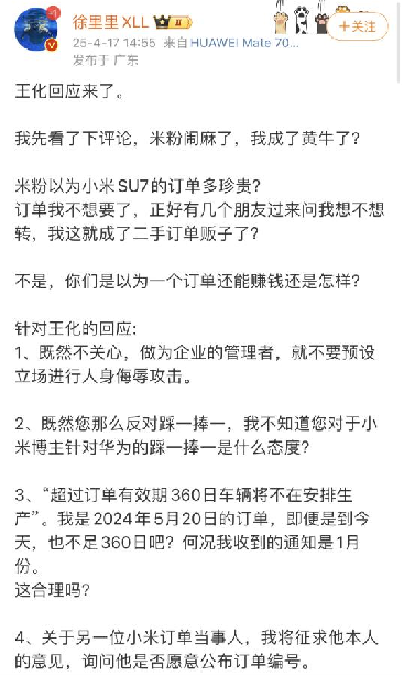 近日,小米集团公关部总经理王化与汽车领域博主@徐里里 关于“小米SU7订单尾款支付流程”的争议引发关注,双方就消费者权益保障、交易安全性等核心问题展开多轮讨论。