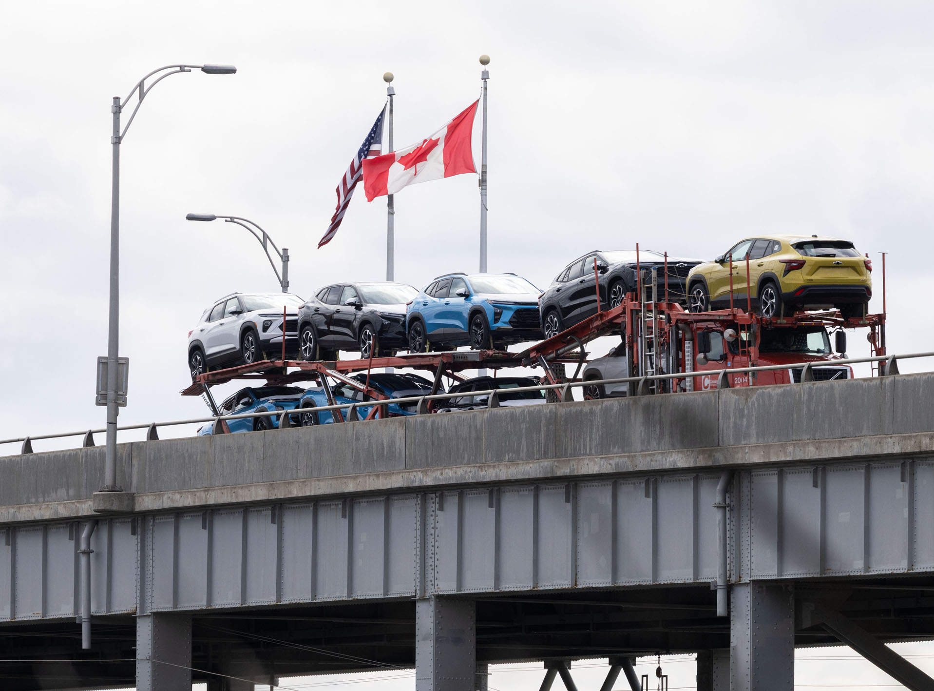 近日,在加拿大安大略省尼亚加拉瀑布市加美边境地带,一辆满载的汽车运输车通过刘易斯顿-昆斯顿桥开往加拿大。新华社发(邹峥 摄)