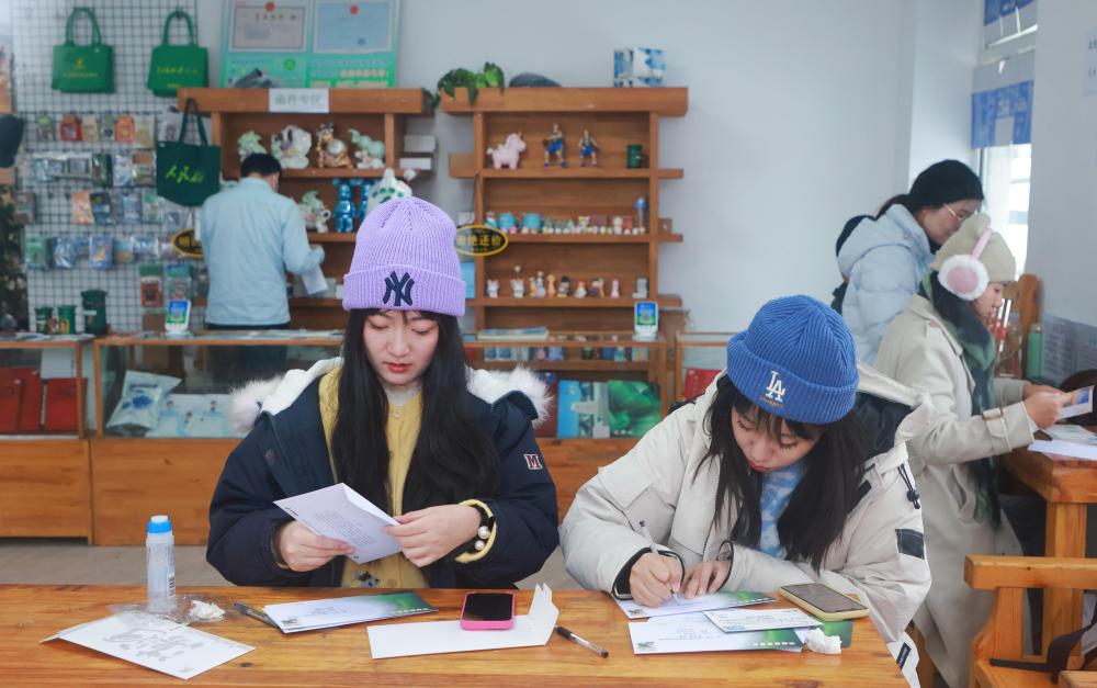 ↑游客在漠河市北极村的中国最北邮局填写明信片。新华社发(徐率摄)