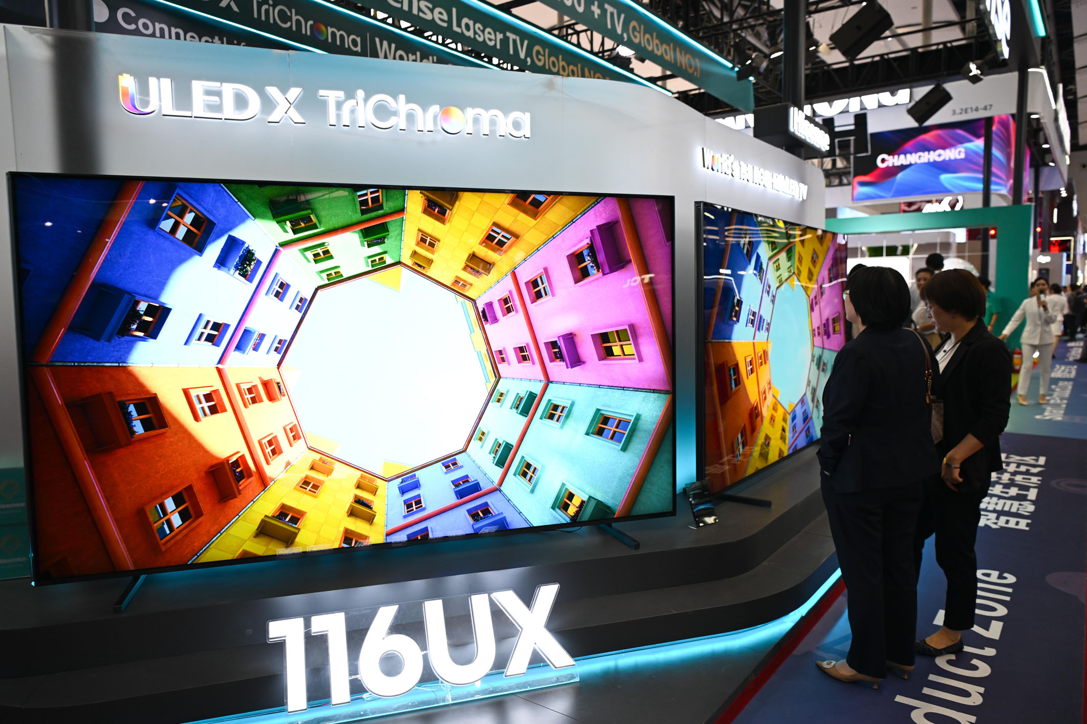 在第137届广交会上,各类融合绿色创新理念的“智造”产品备受外商青睐。图为本届广交会的智慧生活专区,观众在观看大尺寸电视产品。