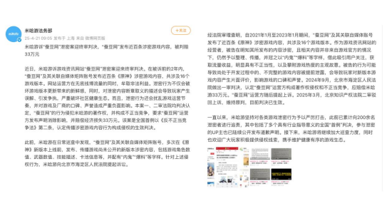 4月21日,米哈游法务部发文称,米哈游诉“蚕豆网”泄密案迎终审判决,“蚕豆网”因在其关联自媒体矩阵账号上发布近百条涉密游戏内容,侵犯米哈游的著作权,并构成不正当竞争,判决要求“蚕豆网”运营方发布声明消除影响,并赔偿经济损失33万元。