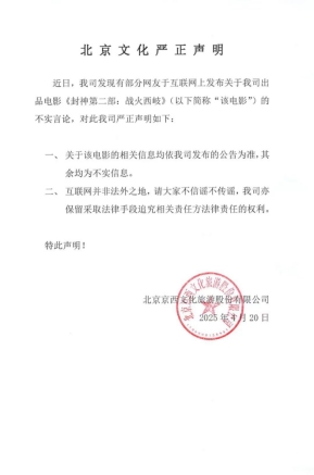 4月20日凌晨,电影出品方北京文化(000802.SZ)发布声明否认了上述言论,并表示关于《封神2》的所有信息均应以北京文化发布的公告为准,其余均为不实信息,并保留采取法律手段追究相关责任方法律责任的权利。
