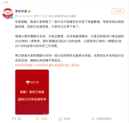 4月22日中午,有大量网友在社交平台反映,“京东外卖‘崩’了”。对此,京东外卖官方发文回应称,“非常抱歉,耽误大家用餐了!因今日午高峰京东外卖下单量暴增,导致系统出现短暂故障,目前已全面恢复,大家可以正常下单了。”