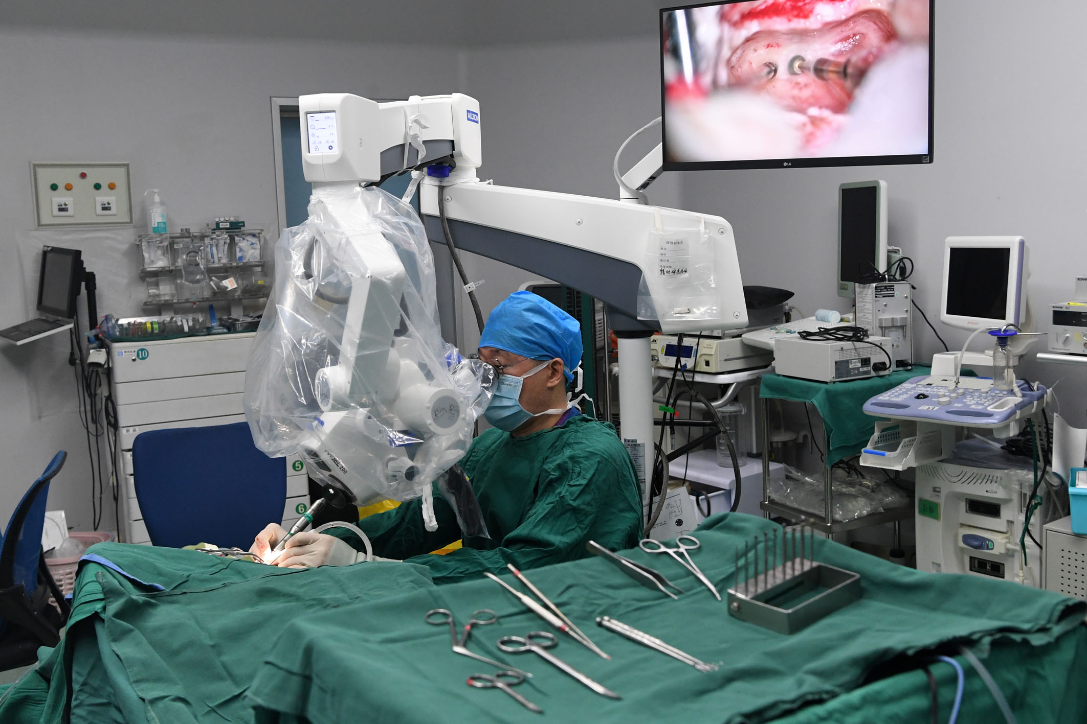 3月3日,在首都医科大学附属北京友谊医院,耳鼻咽喉头颈外科中心主任刘玉和为患者做人工耳蜗植入手术。 新华社记者 马宁 摄