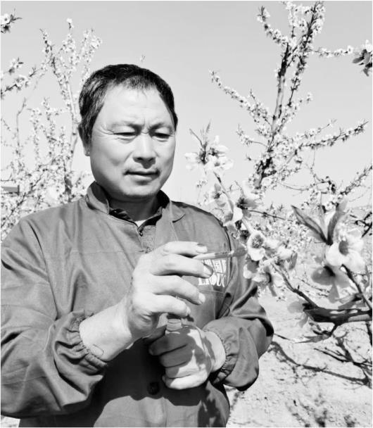 常路镇房家庄村桃农冀成富正在桃园授粉,他说当地桃农都认可新品种、新技术。