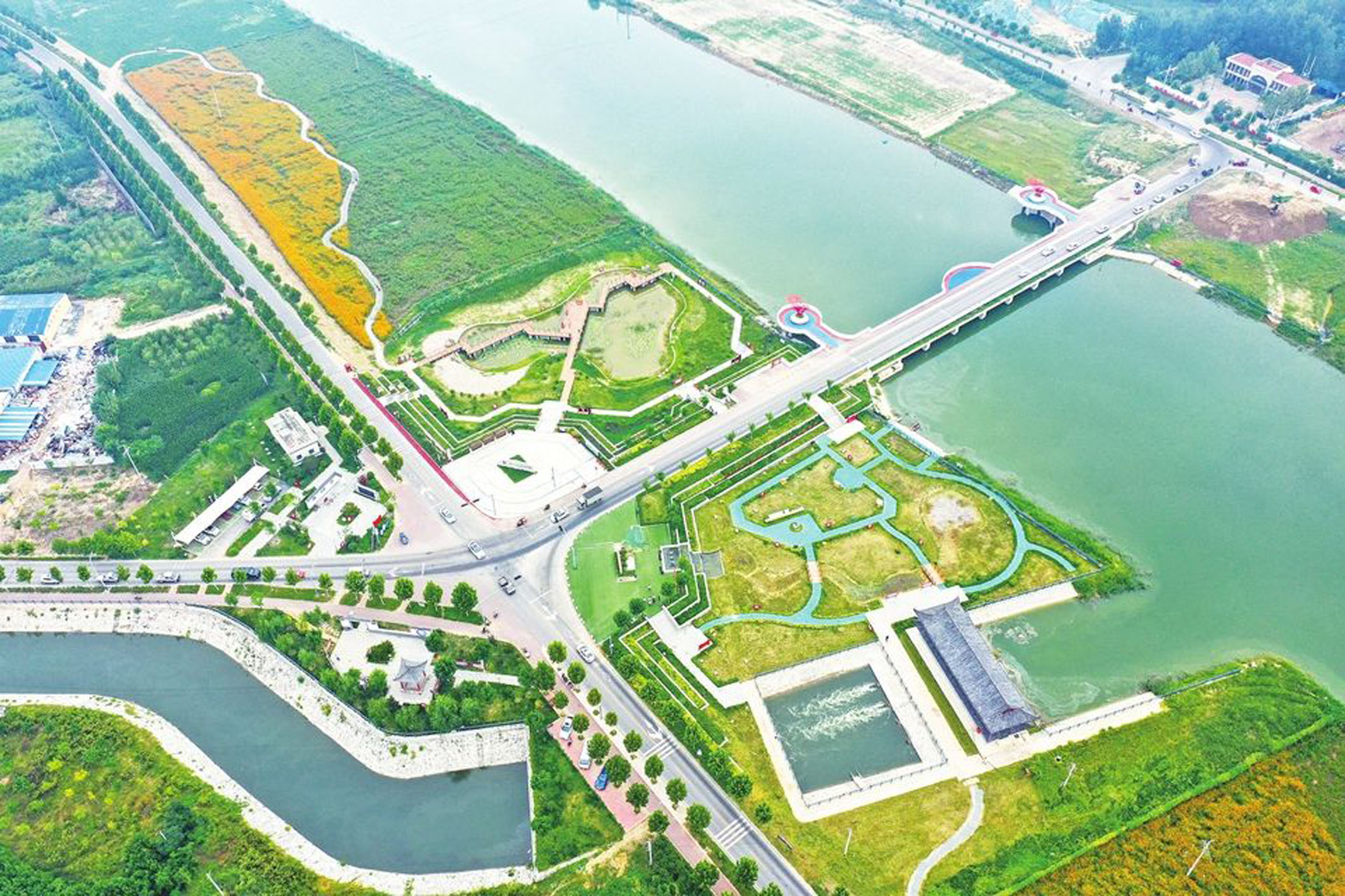 两河“牵手”,成为德州现代水网建设的一次创新。走进德州市沙杨河综合治理工程项目现场,施工人员驾驶挖掘机、运输车来往穿梭,一派热火朝天景象。“作为连通漳卫新河和马颊河的调水通道,沙杨河是德州城区水系连通工程的重要组成部分,也是黄河、大运河‘牵手’的纽带工程。”德州市水利局副局长王书芹说,黄河、大运河“牵手”区域已将水利文物、生态绿廊、文化旅游、全民健身、乡村振兴等有机融为一体。