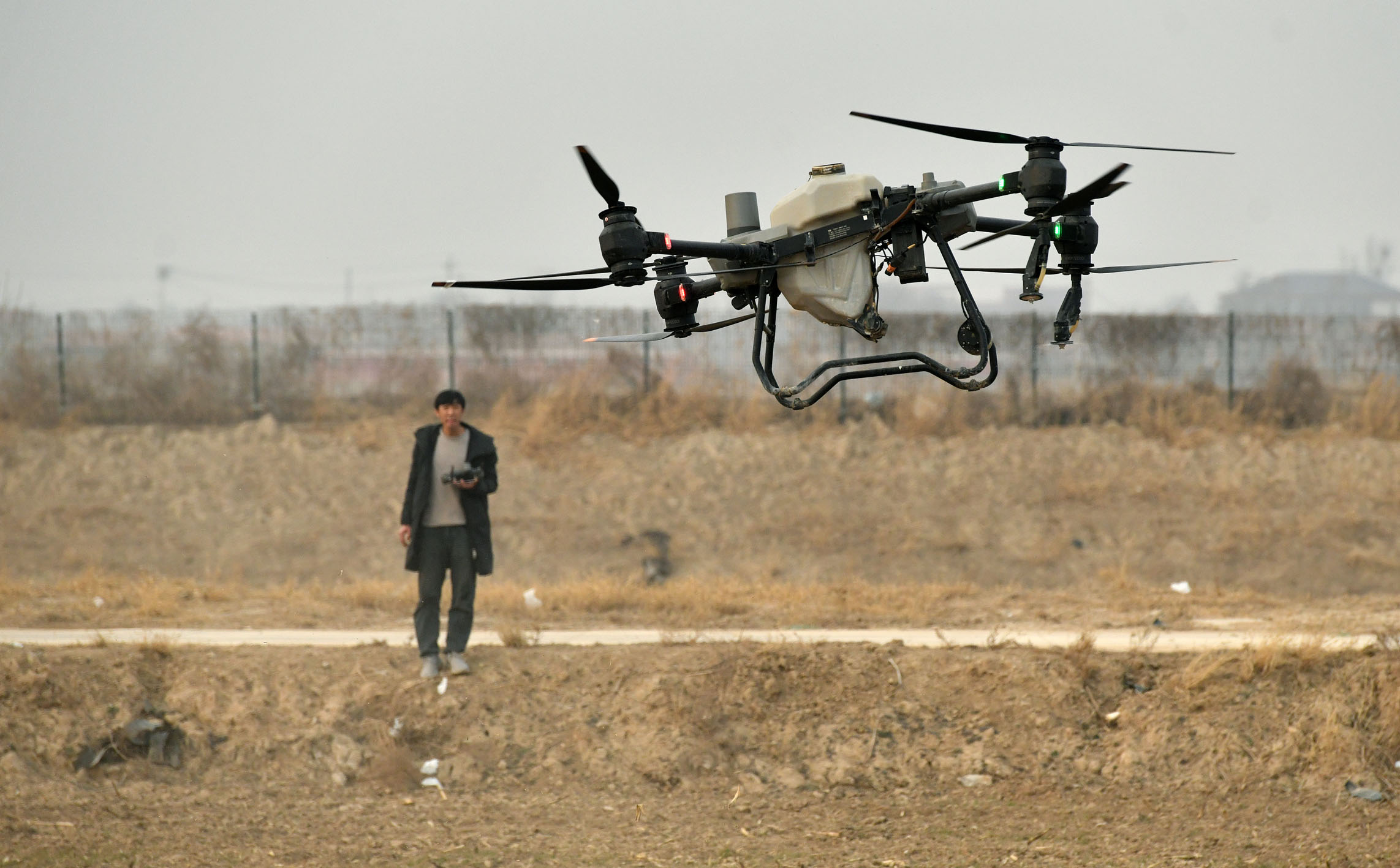 工作人员操作无人机在河北沧县兴济镇南堤村旱碱麦田进行植保作业。 苑立伟 摄