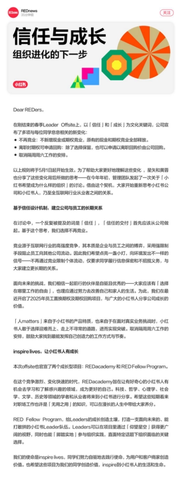 据了解,小红书明确提出取消竞业。全员信称,“我们希望点亮一盏小灯,向环境发出不一样的信号——不再通过竞业限制个体流动,仅要求同学履行信息保密和不招揽义务,与大家建立更长期的关系。”