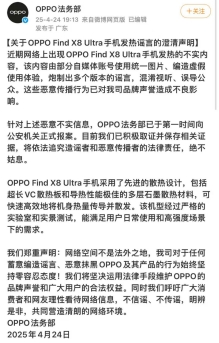 4月24日晚间,OPPO法务部发文回应称,该内容由部分自媒体账号使用统一图片、编造虚假使用体验,炮制出多个版本的谣言,混淆视听、误导公众。这些恶意传播行为已对该公司品牌声誉造成不良影响。