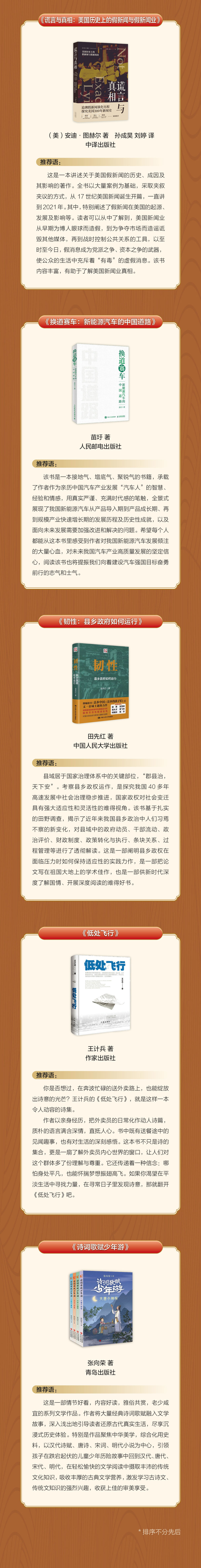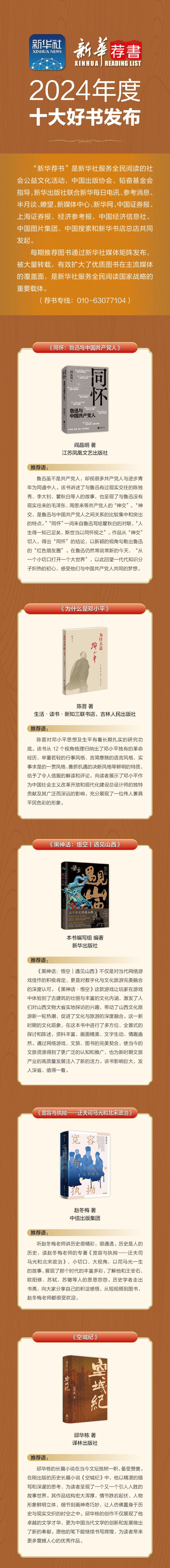 近日,“新华荐书2024年度十大好书”评审活动在京举行。结合网络投票情况,经过现场评议、投票,《同怀:鲁迅与中国共产党人》(江苏凤凰文艺出版社)、《为什么是邓小平》(生活·读书·新知三联书店、吉林人民出版社)、《韧性:县乡政府如何运行》(中国人民大学出版社)、《换道赛车:新能源汽车的中国道路》(人民邮电出版社)、《谎言与真相:美国历史上的假新闻与假新闻业》(中译出版社)、《宽容与执拗——迂夫司马光和北宋政治》(中信出版集团)、《黑神话:悟空|遇见山西》(新华出版社)、《低处飞行》(作家出版社)、《空城纪》(译林出版社)、《诗词歌赋少年游》(青岛出版社)(排名不分先后)入选“新华荐书2024年度十大好书”。