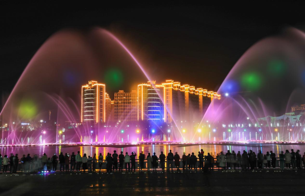 2025年1月31日晚,人们在曲靖市沾益区西河公园观赏音乐喷泉。新华社发(孙文来摄)
