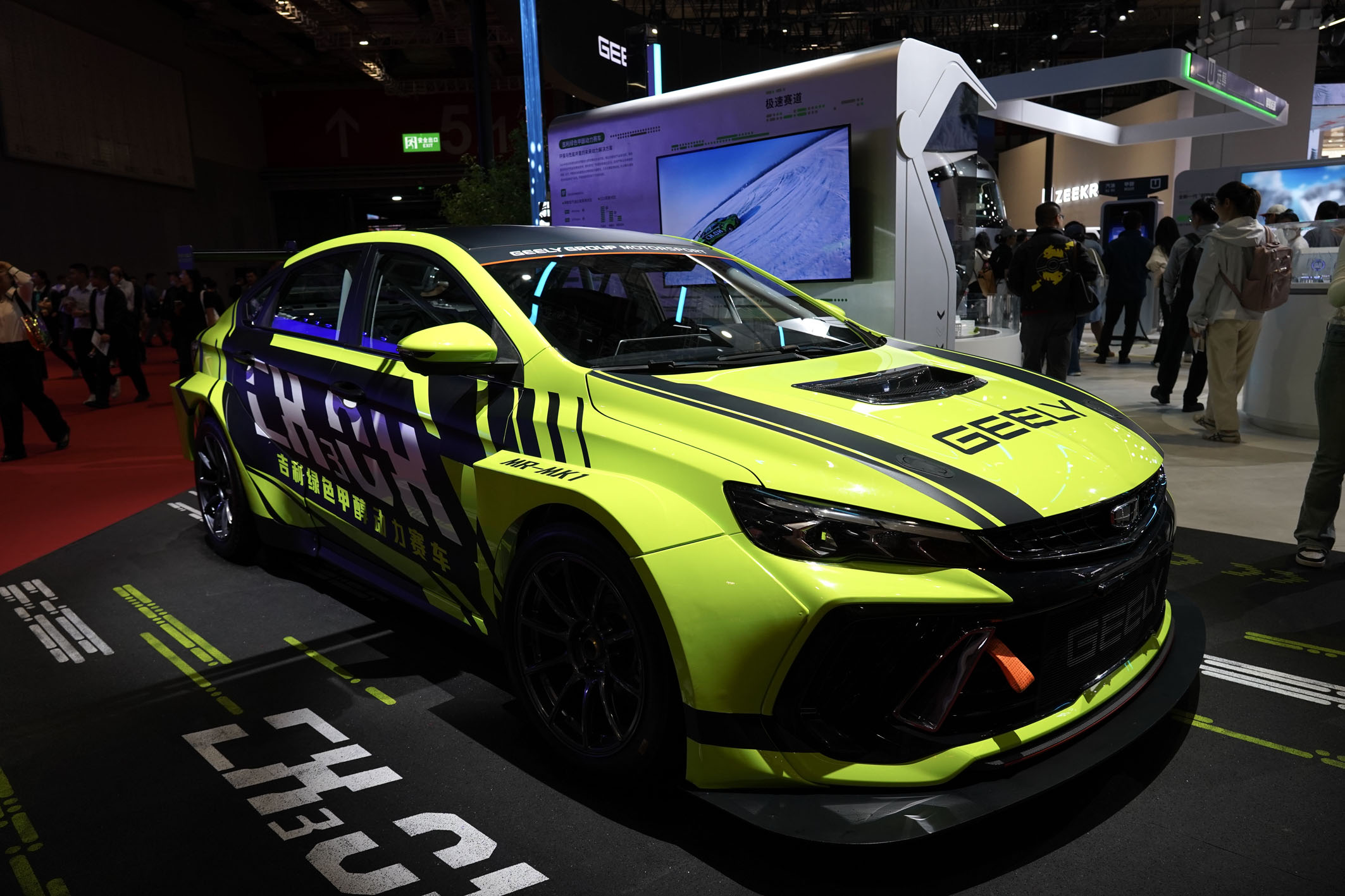 赛道基因与环保理念的融合催生技术创新——吉利首台绿色甲醇动力原型赛车现身“极速赛道”区。该原型赛车于2024年底完成开发,搭载了吉利自研DHE20TDM甲醇发动机,热效率高达46%以上,压缩比达到15:1,相比同级别汽油发动机,拥有更好的动力性能和燃烧效率,具备更宽广的高扭矩输出区间,适用多种赛事场景。展台现场,观众可通过AI模拟赛道技术,亲身感受绿色甲醇赛车的动力输出,还可生成模拟赛场视频,进行打卡分享。图为2025上海车展展示的吉利绿色甲醇动力赛车。