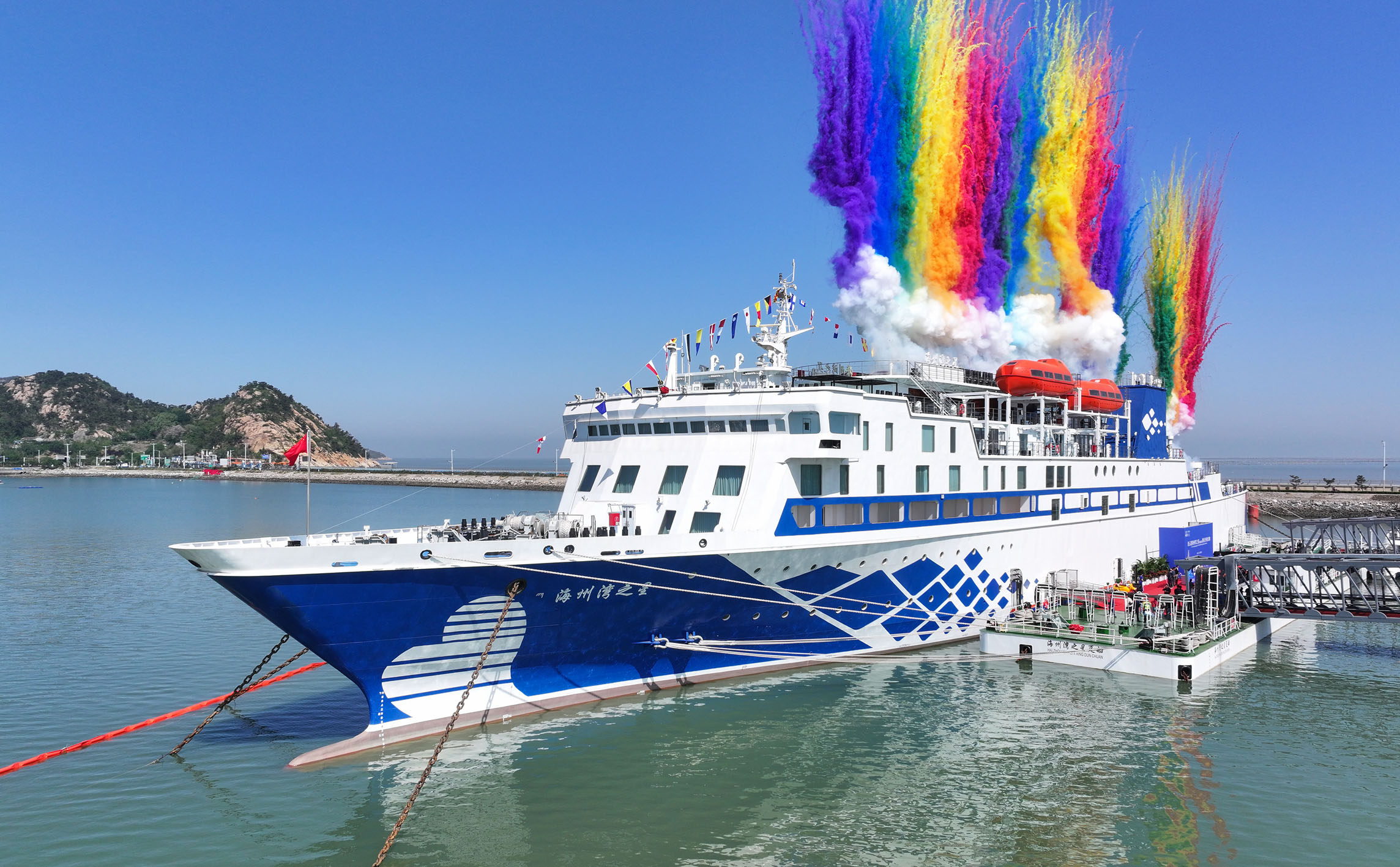 4月28日拍摄的“海州湾之星”号(无人机照片)。当日,集餐饮、住宿、娱乐、研学等功能于一体的海上酒店——“海州湾之星”号在江苏连云港市连云区海州湾畔投入运营。“海州湾之星”号由一艘国际航线客滚船为主体升级改装而成,可提供52间客房、10个餐饮包间及容纳30桌宴会的多功能厅,并配备全日制自助餐厅、海上酒吧、船舶科普展示馆等设施,将推动滨海旅游从传统观光向深度体验升级发展。
