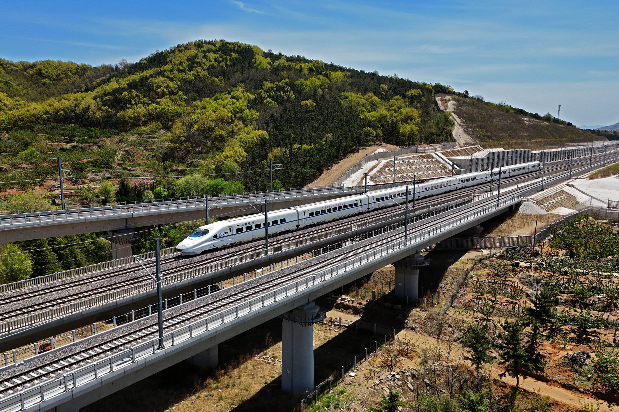 4月29日,动车组列车行驶在山东省烟台市境内(无人机照片)。记者从中国国家铁路集团有限公司获悉,铁路五一假期运输4月29日全面启动,自4月29日至5月6日,为期8天,全国铁路预计发送旅客1.44亿人次、同比增长4.9%,客流最高峰为5月1日。
