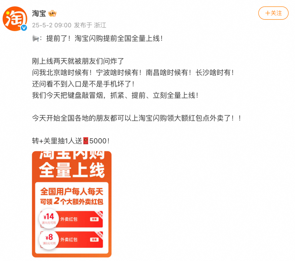 5月2日,淘宝官方微博宣布:淘宝闪购提前全量上线。全国用户今日起可通过淘宝闪购入口领取大额红包购买外卖。