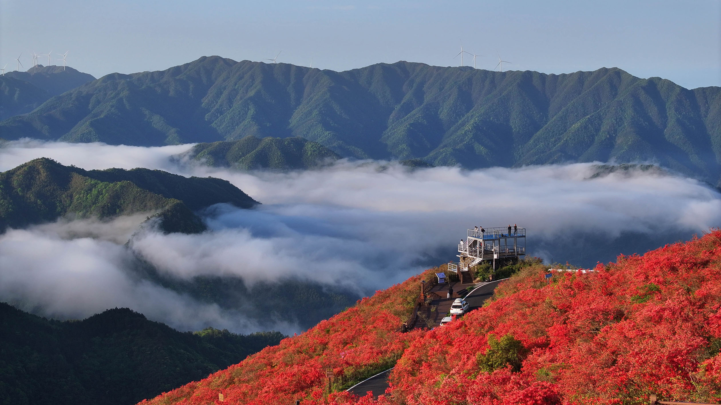 5月1日,在湖南省永州市双牌县阳明山国家森林公园,游人在高山野生杜鹃花海里赏花游玩(无人机照片)。