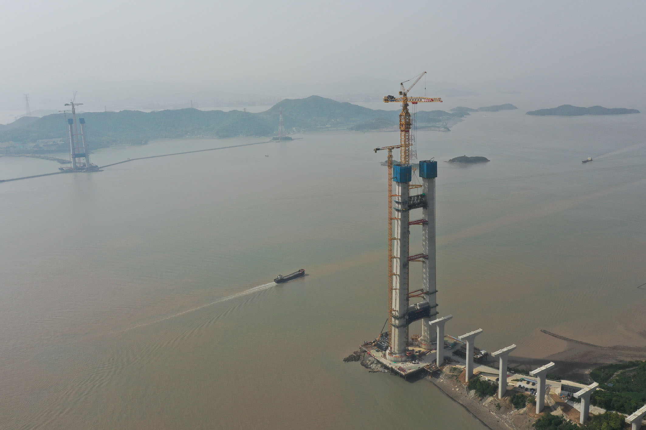 图为5月6日拍摄的双屿门特大桥六横侧施工现场(无人机照片)。当日,由中国铁建大桥局参建的浙江宁波舟山港六横公路大桥二期工程双屿门特大桥六横侧索塔塔高突破200米,标志着项目建设取得阶段性进展,为后续施工奠定基础。